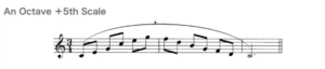 一方で、音域の広いスケールには、「ドミソド」のように3度や4度で跳躍するものや、1オクターブ、あるいは1.5オクターブにわたるものがあります。